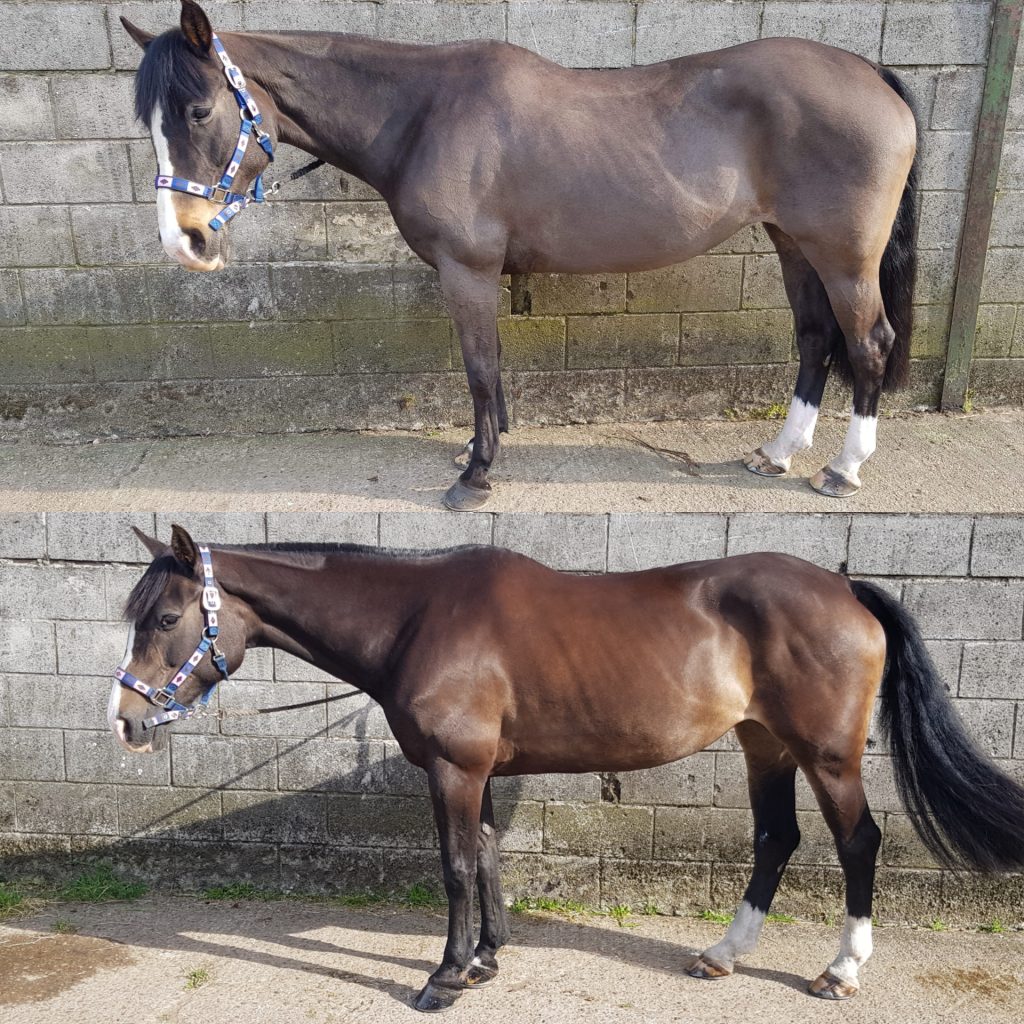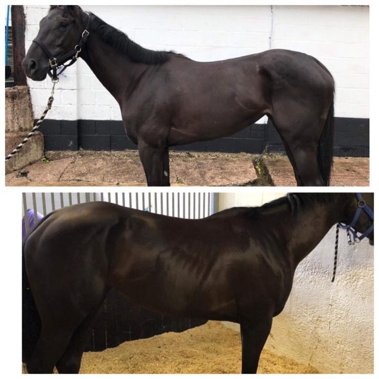 We have been using Codolette Crumbs on a 4 year old TB filly that was sent into training with us. She arrived very lean and under nourished, lacking muscle, but within 15 days of canter work, our regular diet and Codolette Crumbs the improvement is extremely visible. Her form on the racecourse was poor but within 6 weeks of using this product has improved to only being beaten 5 lengths. The photos were taken 15 days apart.